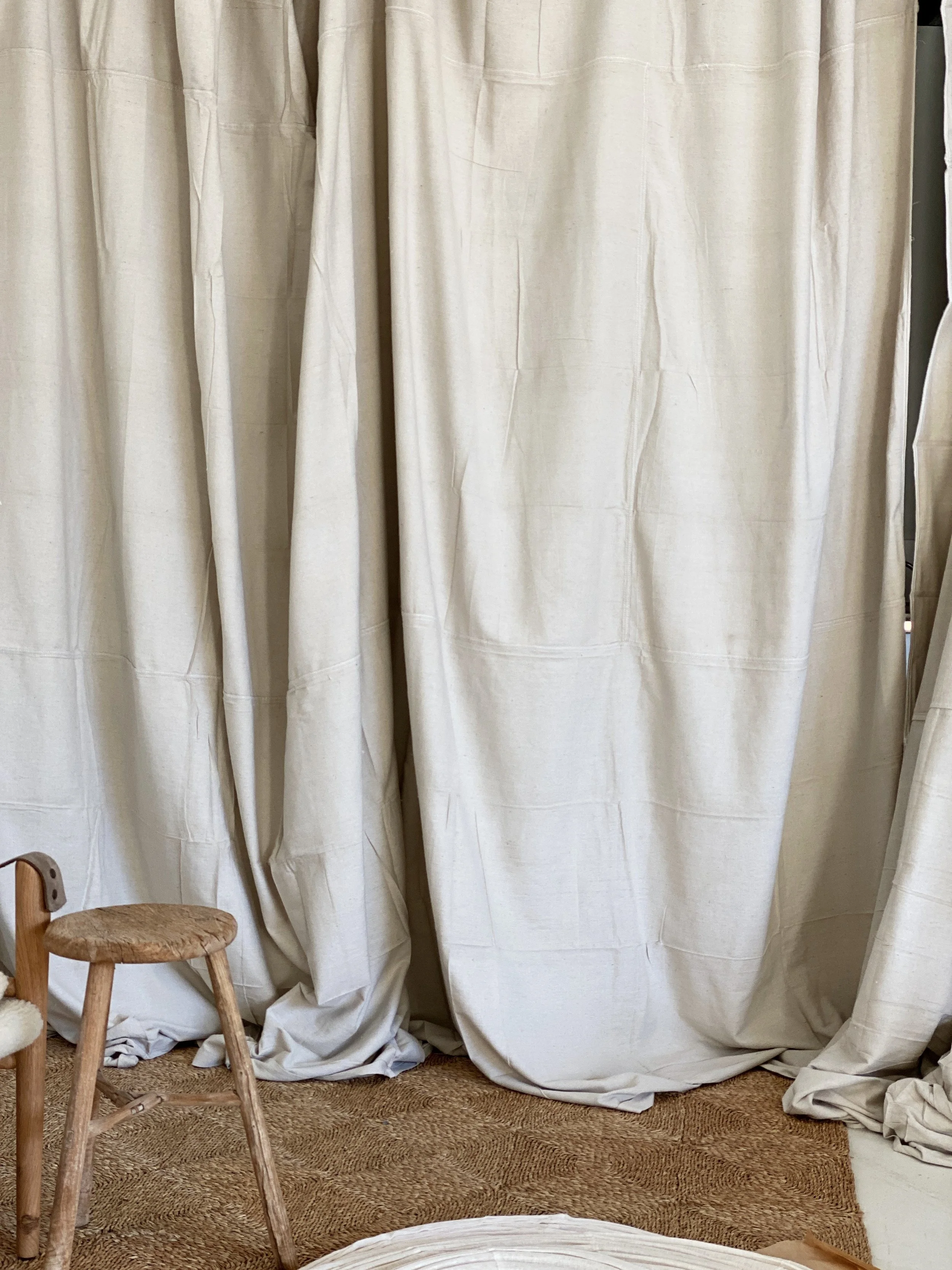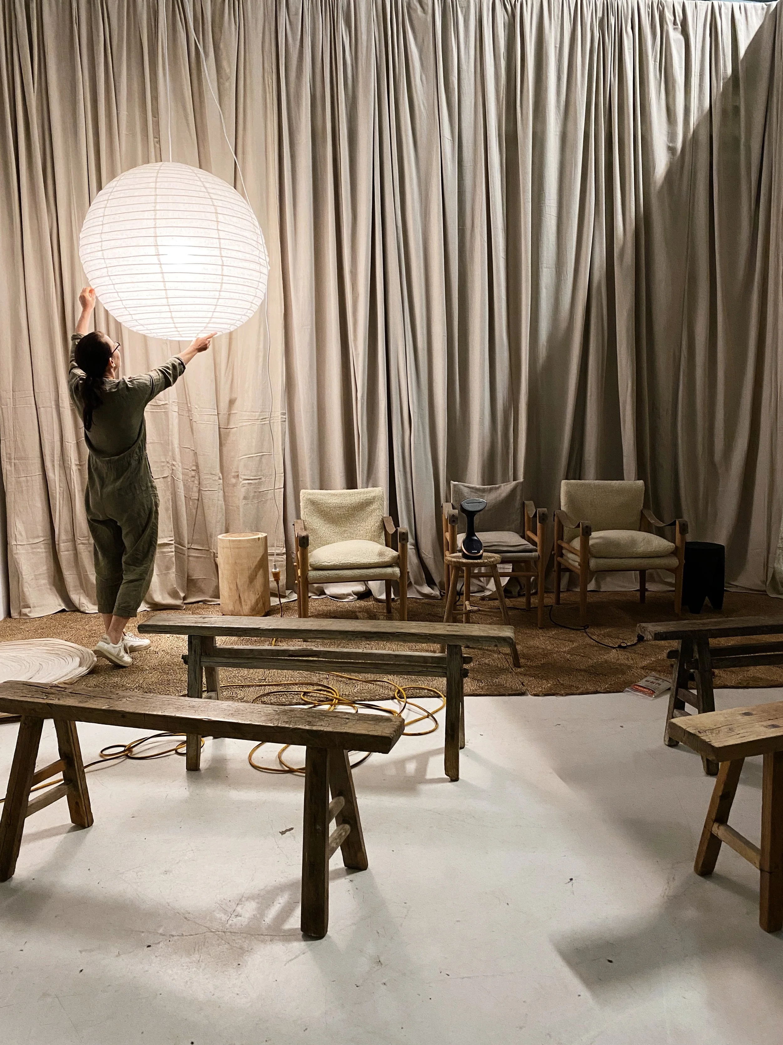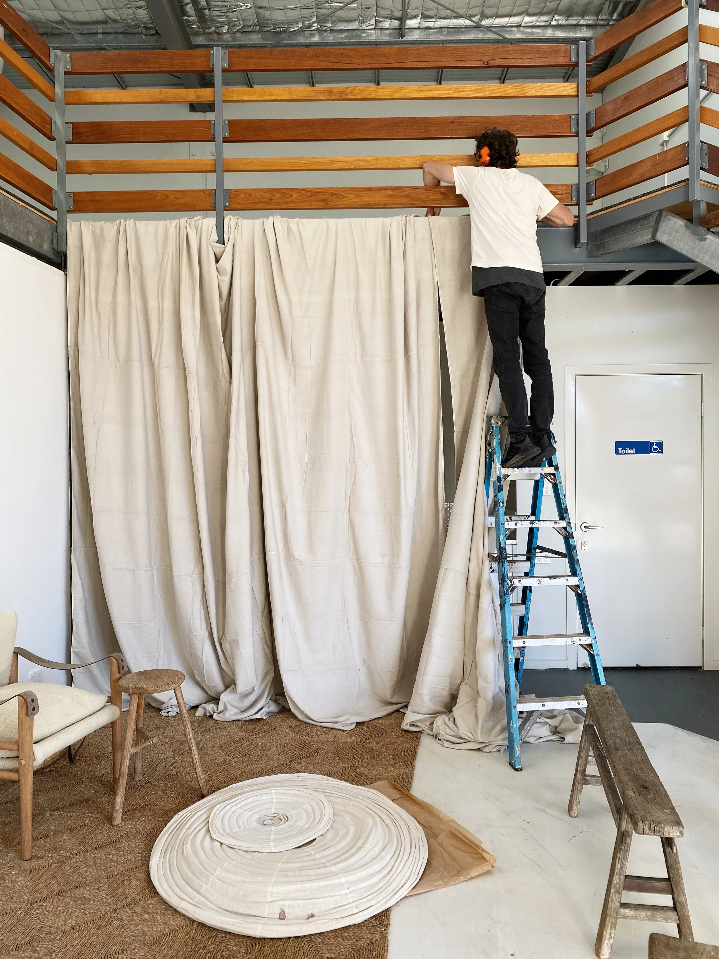 Example: In the warehouse I tried to work with the timber balustrades but they were too distracting so I decided to hide them with cotton canvas painters drop sheets.