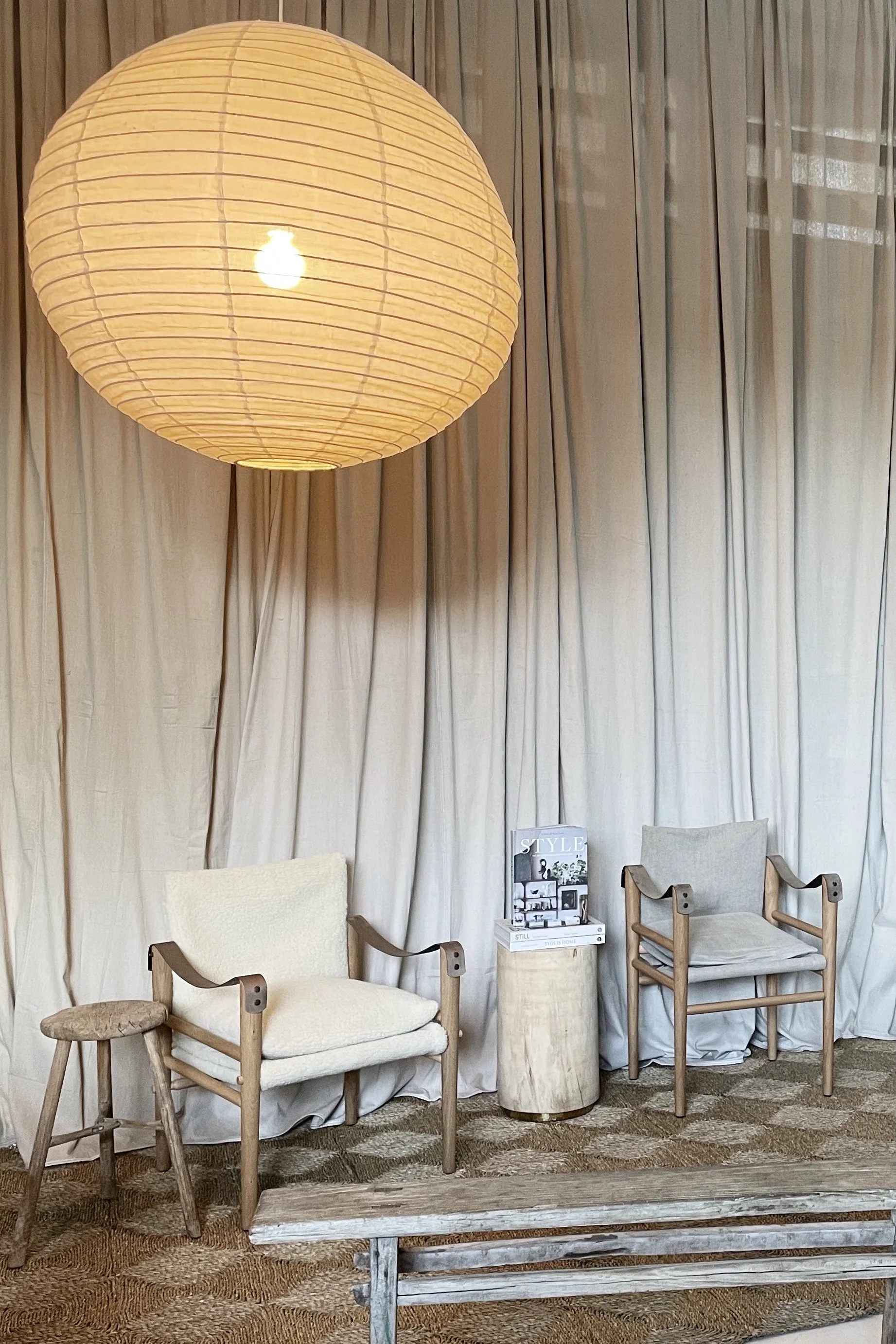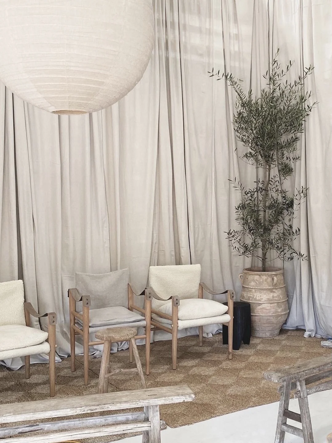 Example: Textural seagrass rugs, shearling chairs, linen pendants, rustic timber stools all added the necessary visual interest to transform the space from a concrete cube to an intimate space to gather.