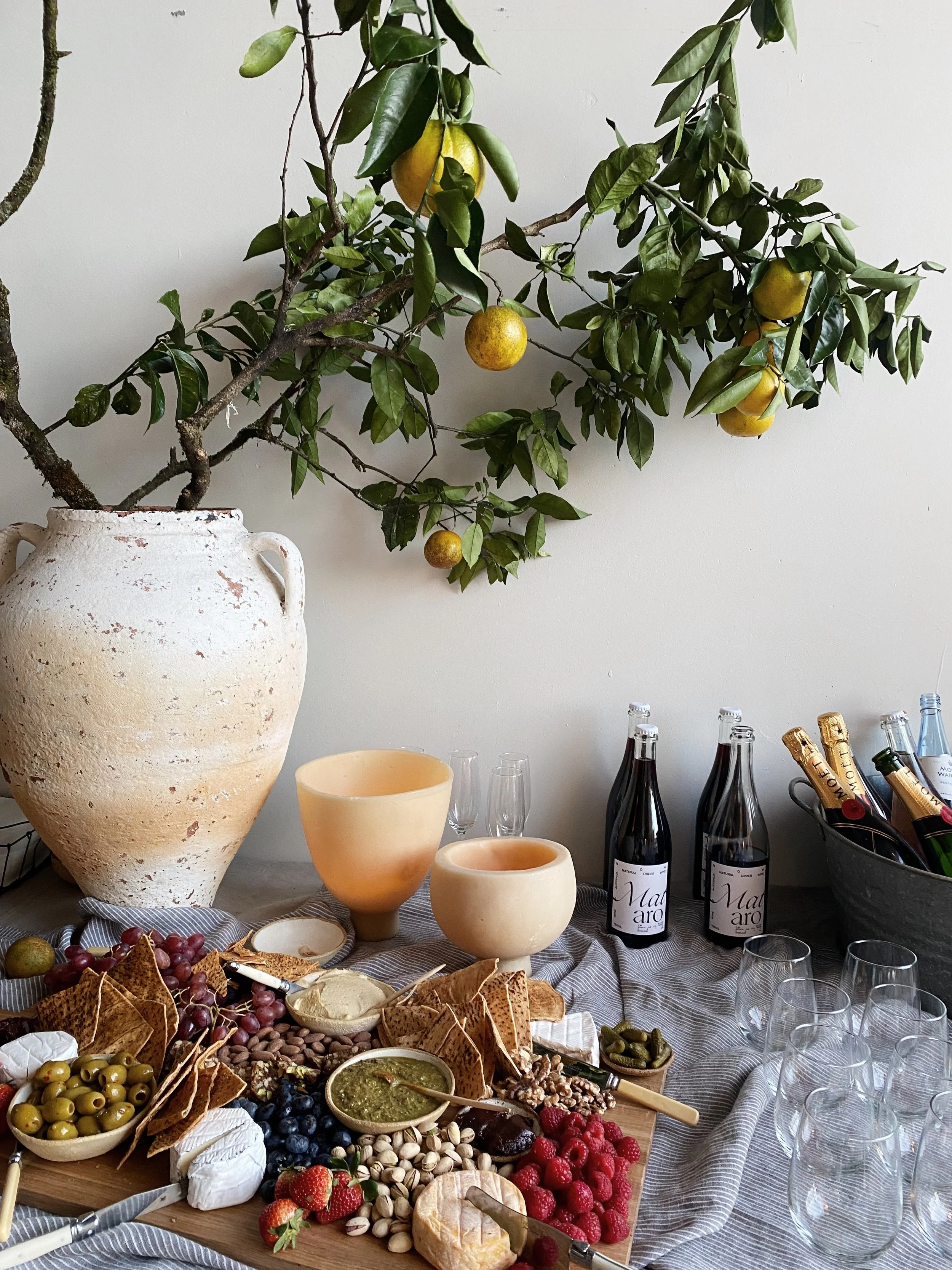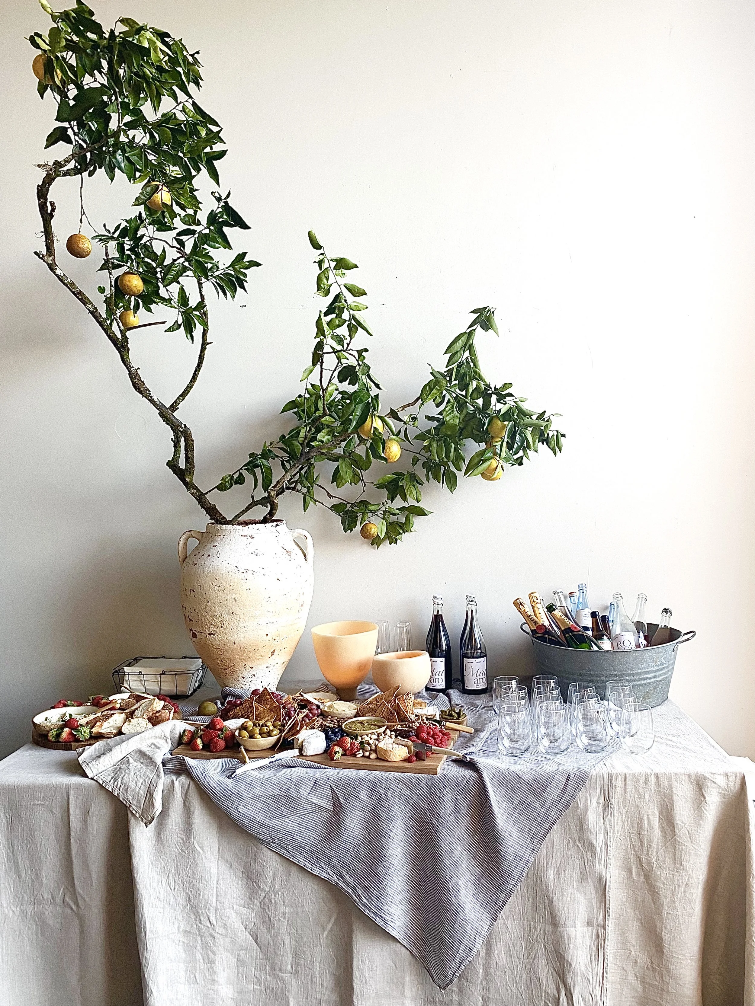 Example: On the ‘stage’ I hung an oversized linen pendant, which helped to bring the ceiling down, and make the event more intimate. I also added a potted olive tree, helping to add verticality and visual interest. On the drinks table I used an oversized Turkish pot and filled it with a cutting from the orange tree at home (foraging is your friend).