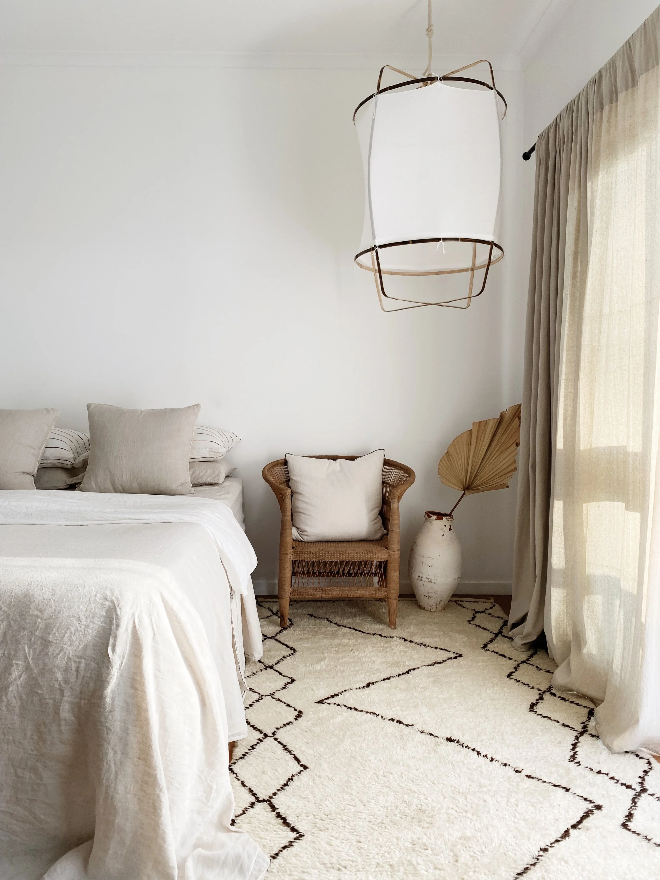 To create a bedroom that feels calm and serene I opt for timeless hardware, natural materials, neutral textures and something a little unexpected, such as an oversized pendant.